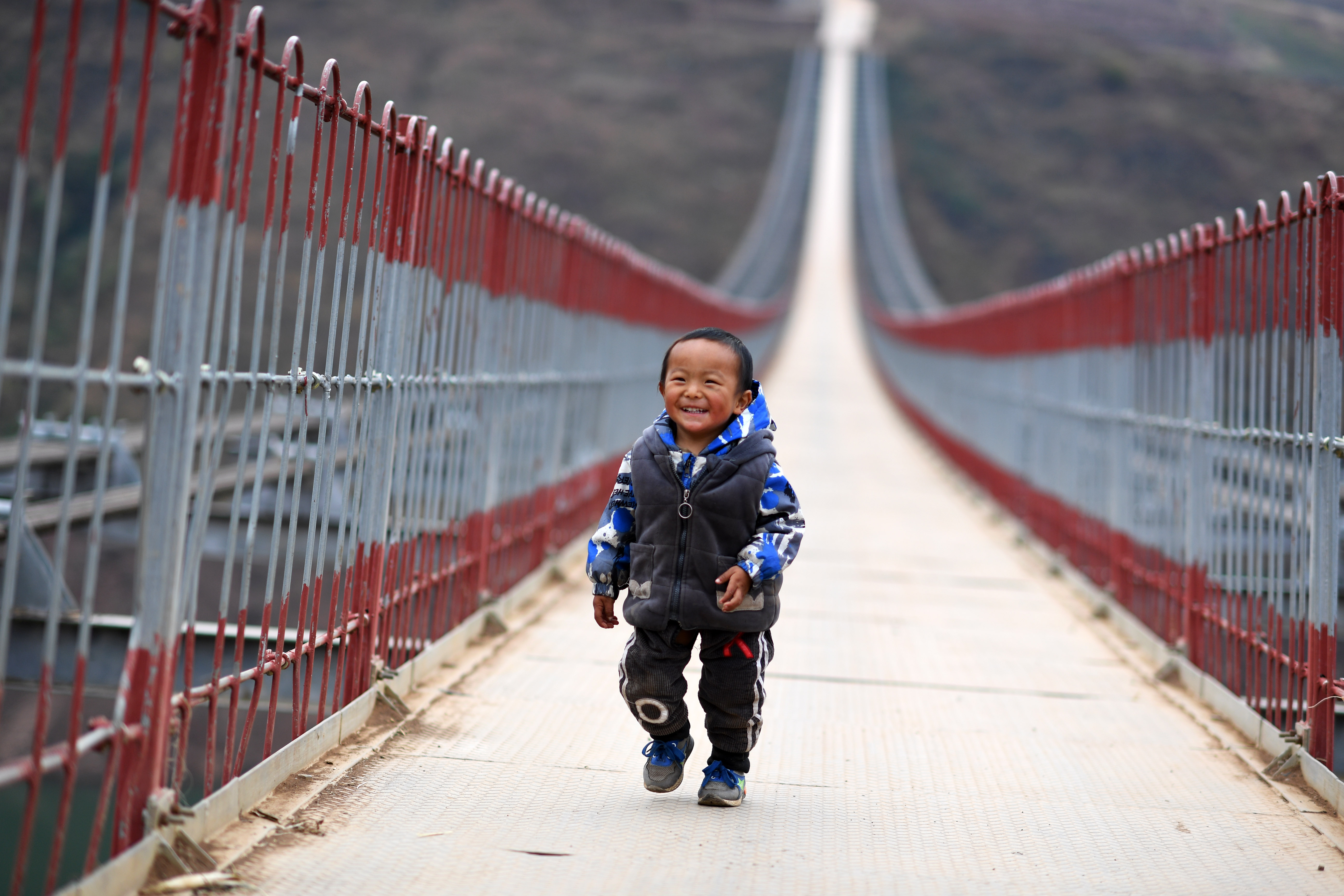 一个孩子行走在贵州省威宁县玉龙镇“溜索改桥”后的人行桥上。(2019年2月11日摄)
