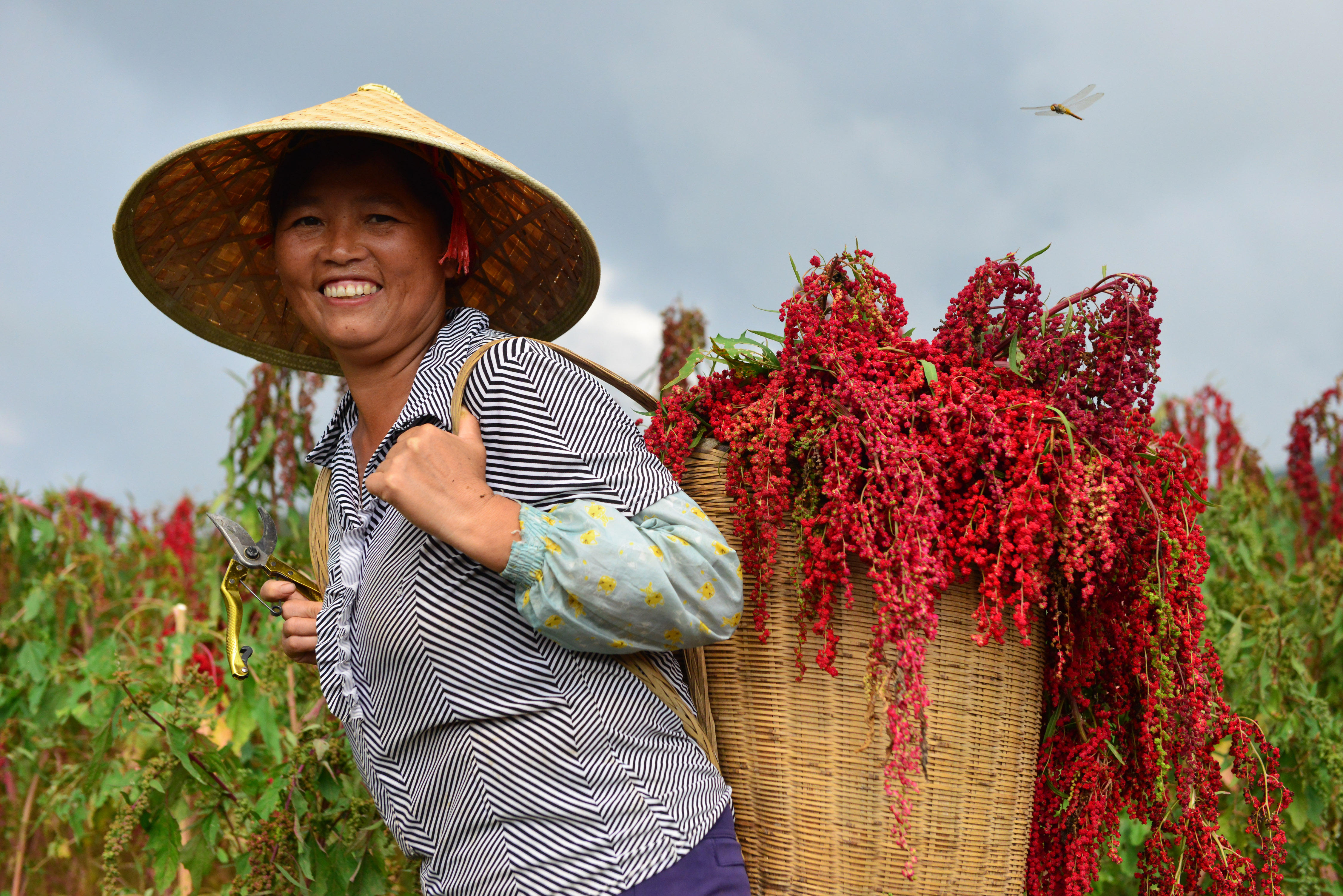 农民在贵州省剑河县南明镇永兴农机专业合作社种植基地搬运红藜麦。(2017年8月29日摄)