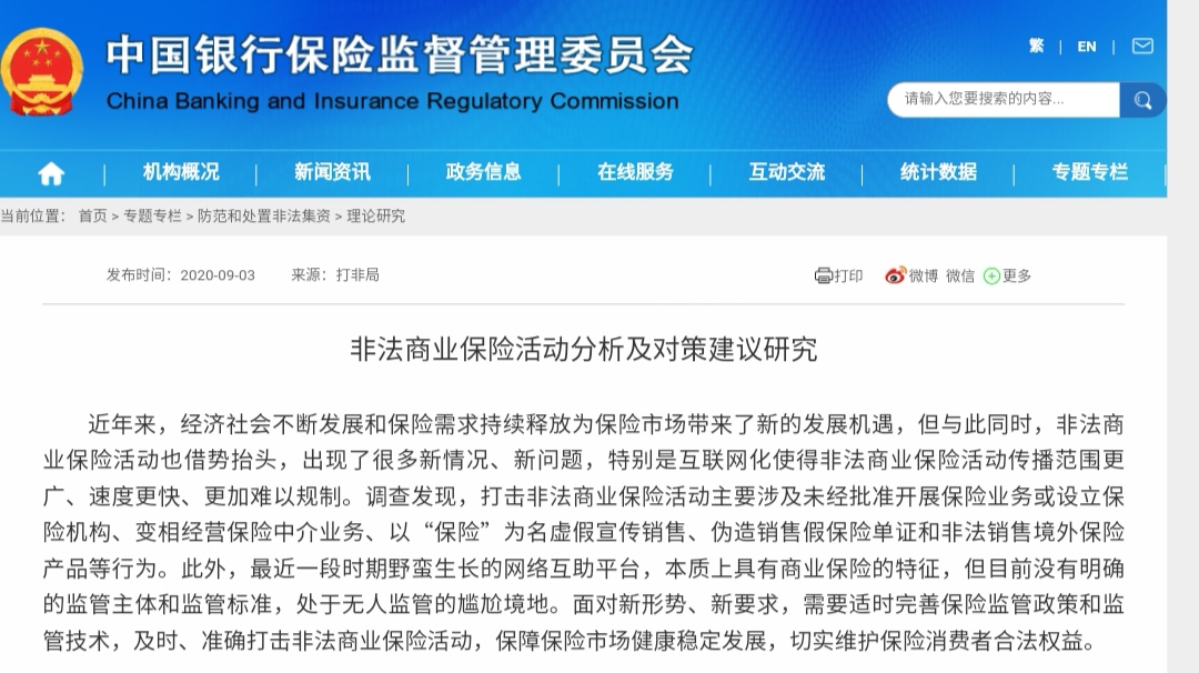 2020年9月,银保监会打非局曾在银保监会官网发布理论文章《非法商业保险活动分析及对策建议研究》,明确指出有的网络互助平台会员数量庞大,属于非持牌经营,涉众风险不容忽视,部分前置收费模式平台形成沉淀资金,存在跑路风险,如果处理不当、管理不到位还可能引发社会风险。