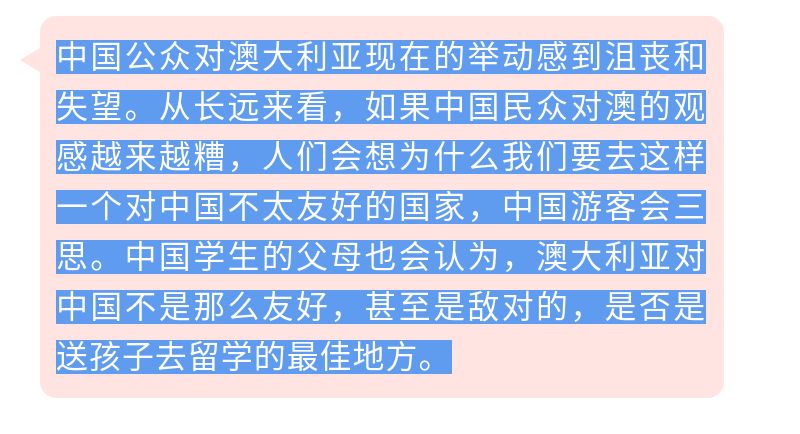 另一个例子是,继2020年6月5日文化和旅游部发布“赴澳大利亚旅游安全提醒”,呼吁中国游客“切勿前往澳洲旅游”后,6月9日教育部发布了《2020年第一号留学预警》,考虑到全球新冠肺炎疫情扩散蔓延势头没有得到有效控制,国际旅行和开放校园存在风险,以及疫情期间澳大利亚发生多起针对亚裔的歧视性事件,提醒广大留学人员做好风险评估,当前谨慎选择赴澳或返澳学习。