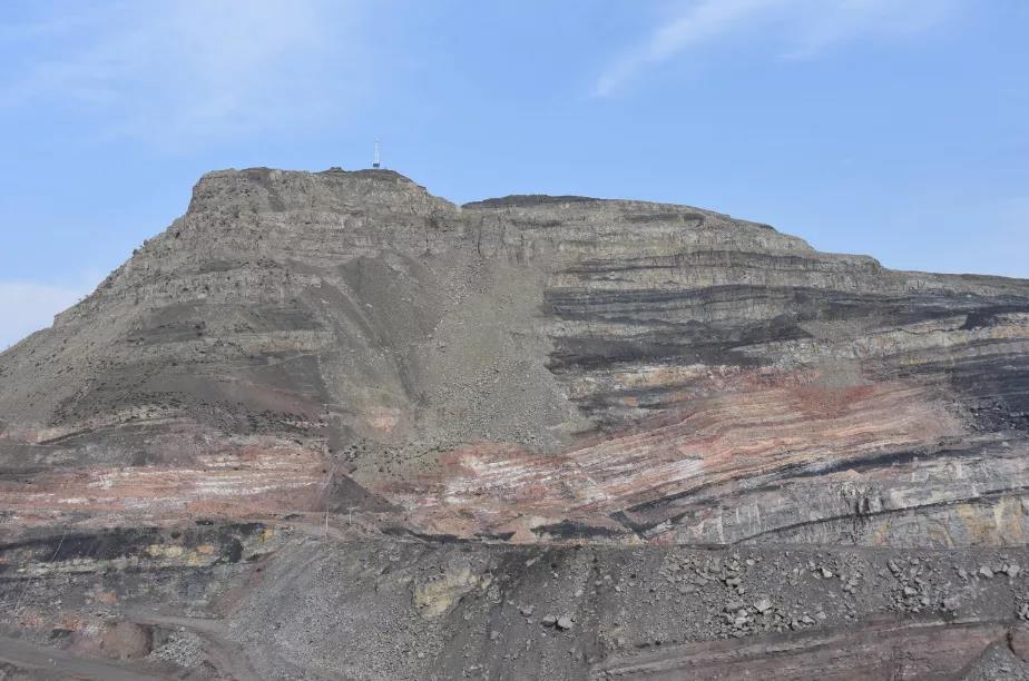 环顾四周,一些山头已经被烧塌,山体表面也由原来的青灰色变成了红褐色,眼前一座130米高的山体就像丹霞地貌。