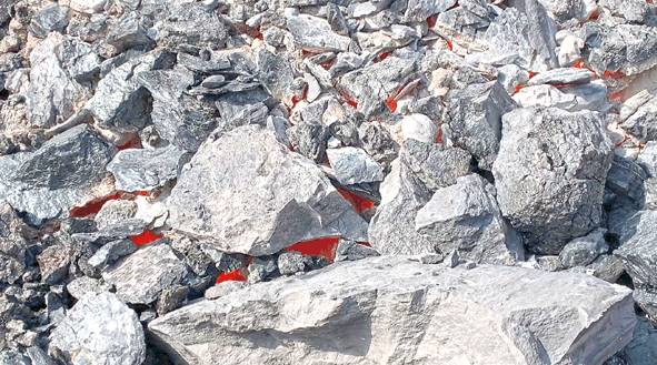 太西煤的特点是在燃烧时往往看不到烟气,但在阳光的映照下,记者能明显地看到山体周边热浪忽闪。为了近距离查看煤炭自燃情况,记者又来到了大石头火区一明火点,刚一下车,就感觉脚下发烫。走到山脚下,热气愈加明显,从岩石缝隙向里看,山体内部像锅炉的炉膛一样呼呼燃烧。