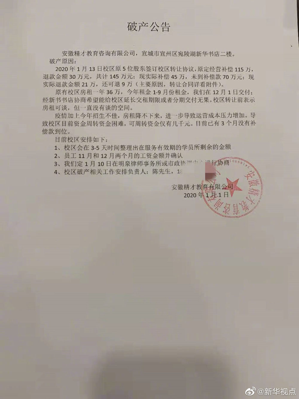 【学生已交100余万培训费用,培训机构岂能说走就走】新华社“全民拍”近日接到安徽省宣城市一些学生家长反映,当地某教育咨询有限公司于1月1日突然自行发布“破产公告”,由其运营的“番茄田”少儿艺术培训机构关闭,270多名学生的培训课程随之停止。