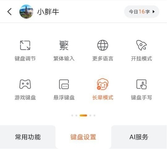 为了方便长辈们一键设置开启长辈模式,除了在App设置中增加独立的“长辈输入设置”入口外,还可在键盘端点击左上角S标,在“键盘设置”中选择使用“长辈模式”。