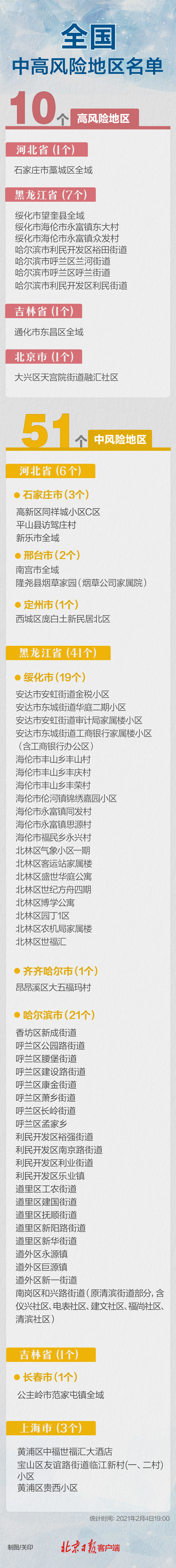 北京日报客户端记者梳理发现,截至2021年2月4日19时,全国共有10个高风险区和51个中风险区。分布如下:
