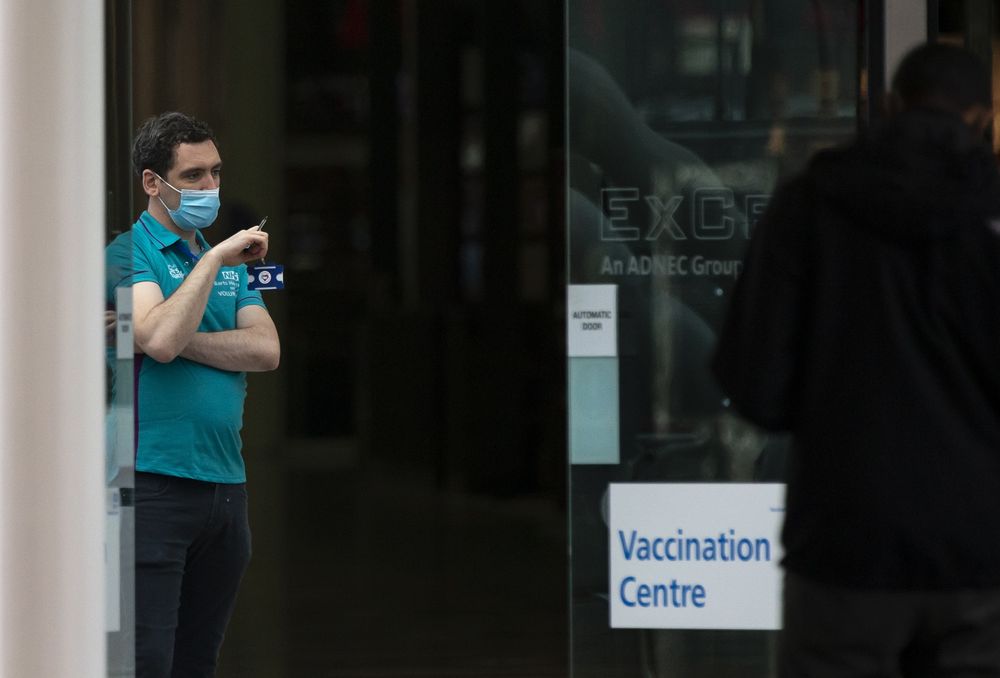 1月12日,一名工作人员站在位于英国伦敦ExCel会展中心的疫苗接种中心内。(新华社记者韩岩摄)