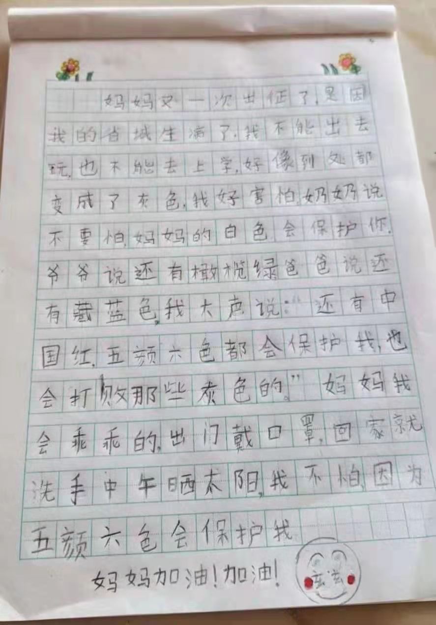 “妈妈又一次出征了,是因我的省城(石家庄)‘生病’了。我不能出去玩,也不能上学,好像到处都变成了‘灰色’。”7岁的李小凡在田字格本上,一笔一画地写着。