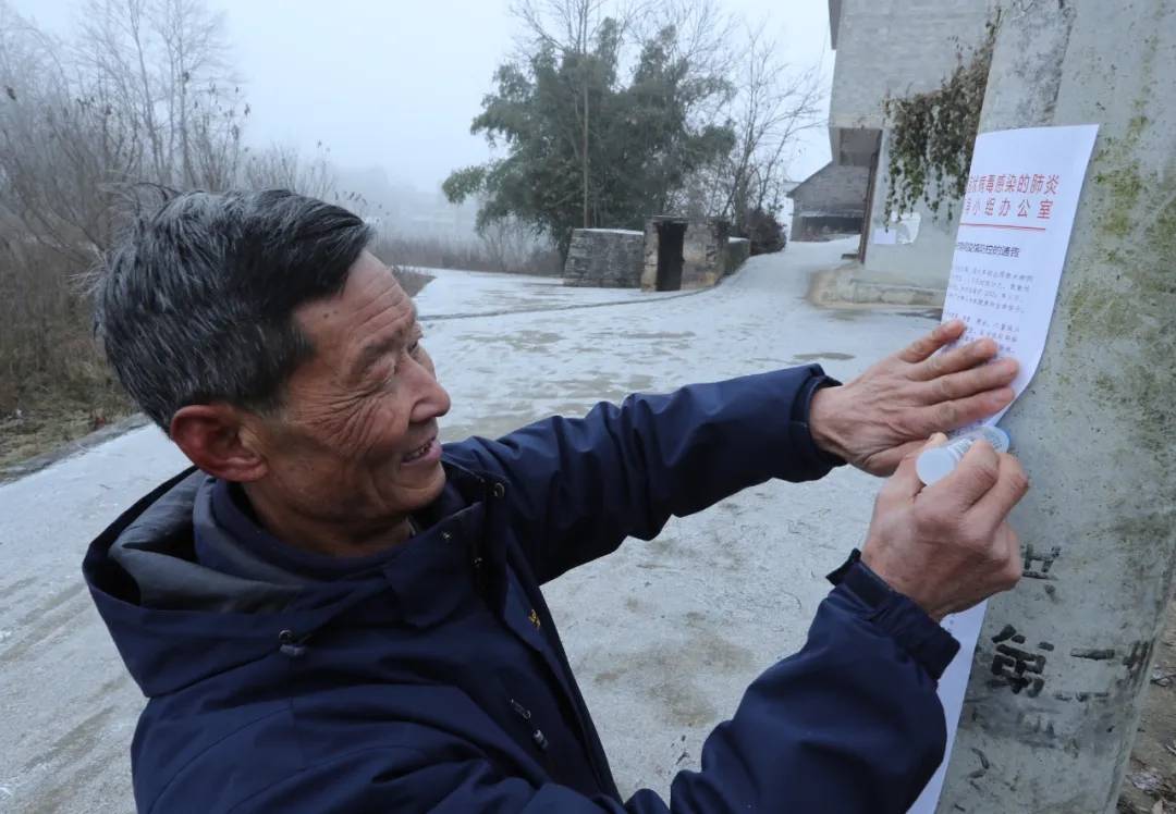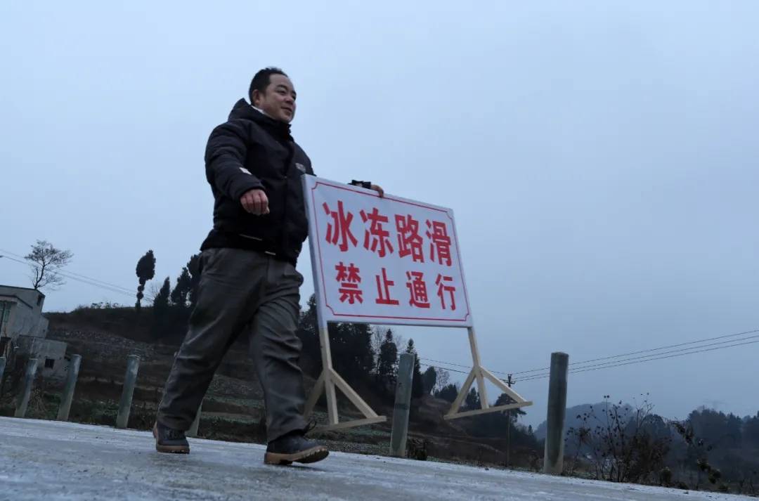 村干部在路口放置警示牌,提醒过往行人和车辆注意安全