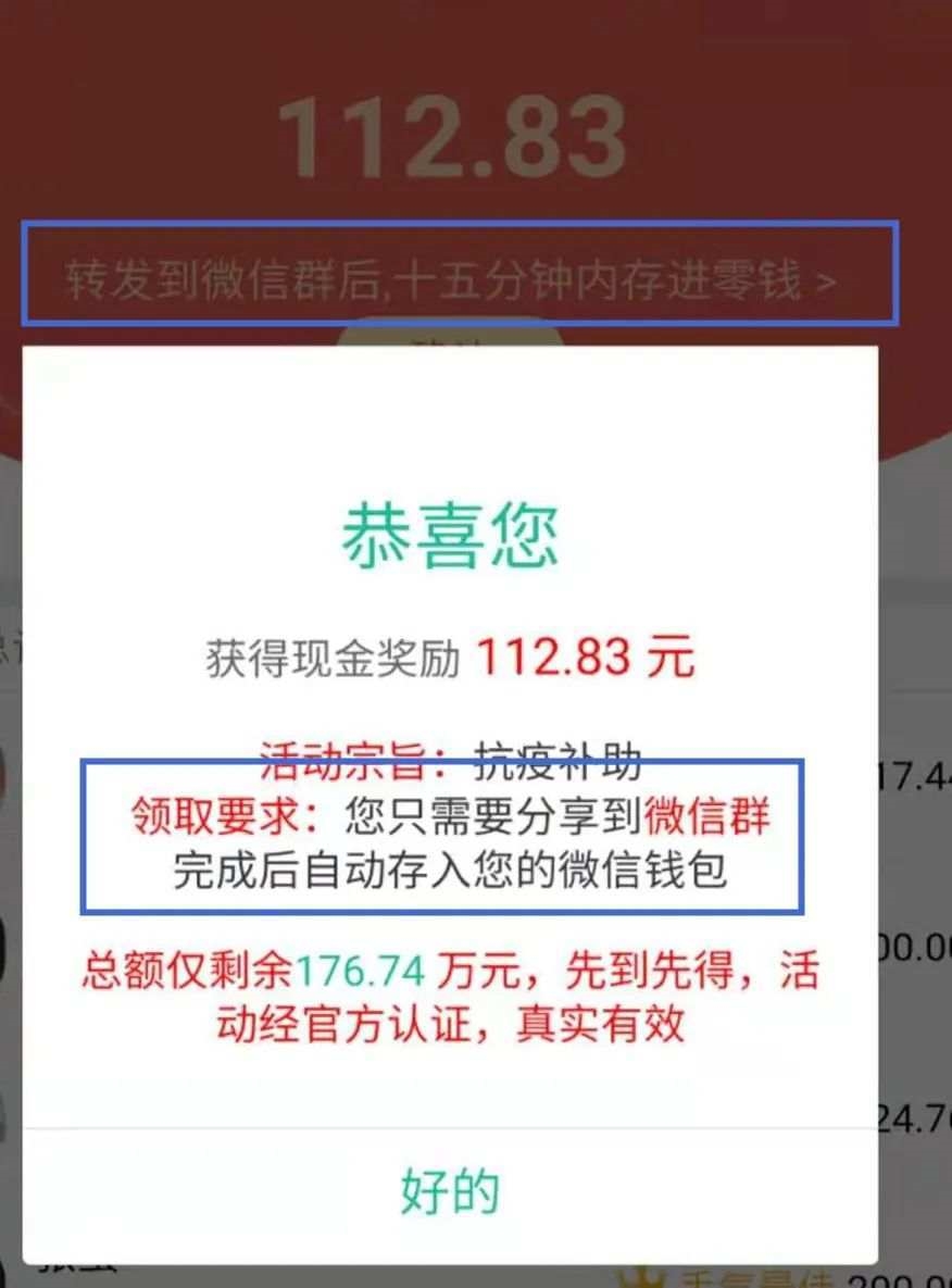 很快,就轻轻松松的领到了112.83元,但需要分享该链接到微信群,完成后“红包”自动存入微信钱包,并且仅剩余176.74万元了。(几秒钟时间就从3550万元变成了176万元,看来活动火爆到爆呀!)