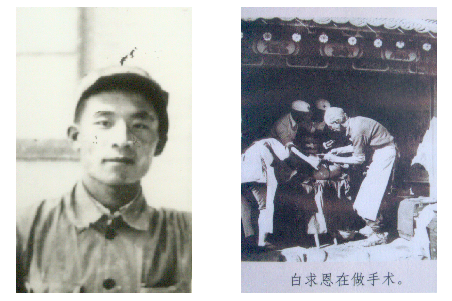 1938年5月,辛育龄参加八路军(左图)1939年5月,白求恩给伤员做手术,辛育龄在现场负责伤员分类工作(右图)(图片由中日友好医院提供)