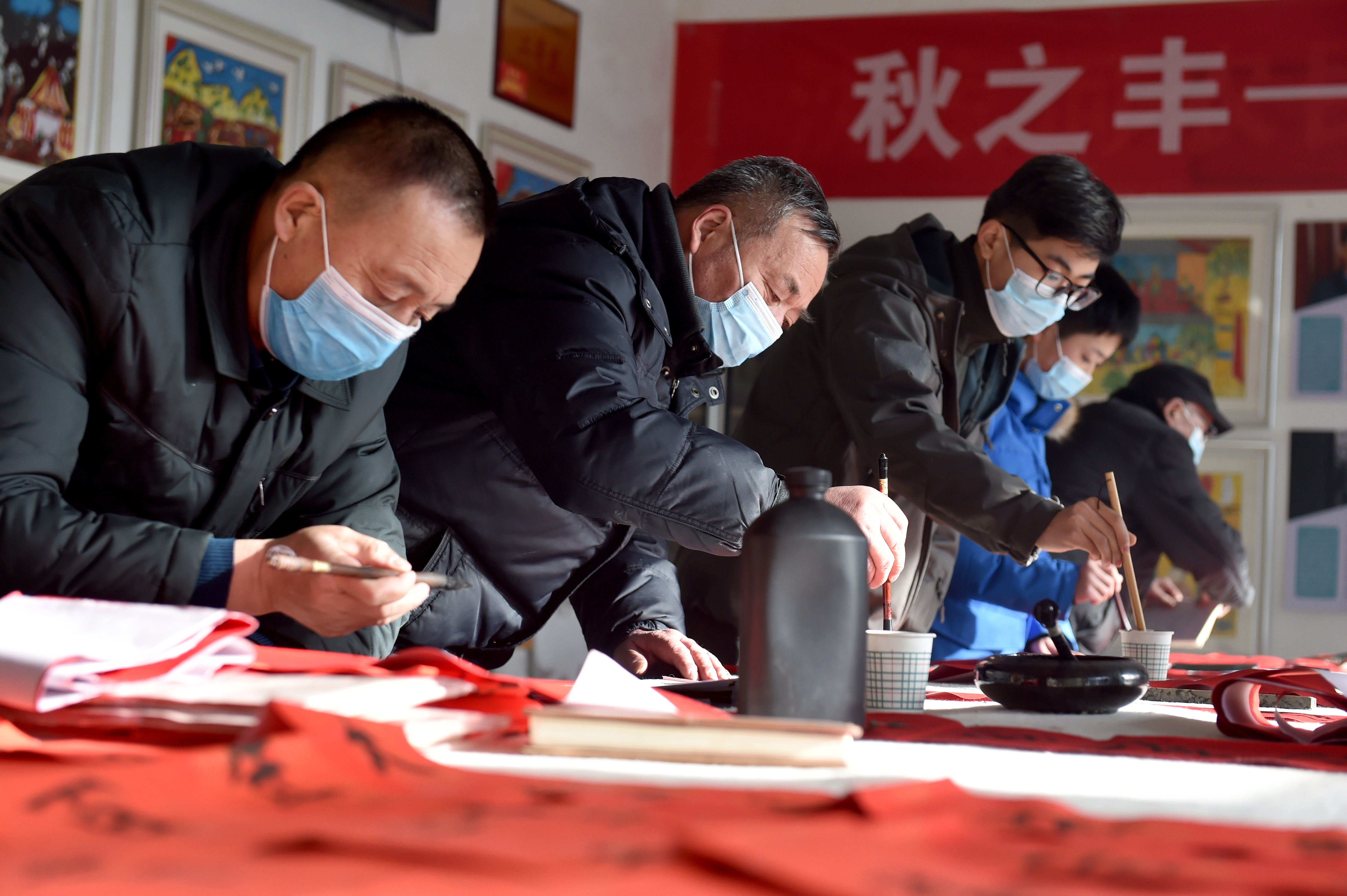 村民们佩戴好口罩,线下写春联、迎新春。新华社记者 唐如峰摄