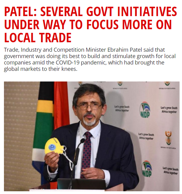 据南非当地媒体2月4日报道,南非贸易、工业部与竞争部部长易卜拉欣·帕特尔表示,南非政府将调整政府采购政策,尽最大努力采购南非制造产品, 刺激本国经济增长。