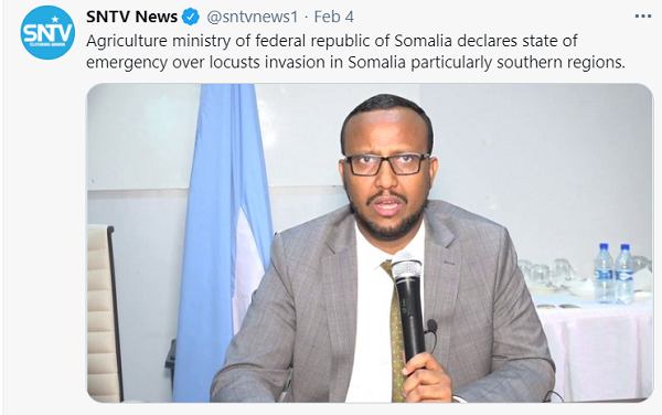 索马里国家电视台当地时间4日发布消息说,索马里农业部长宣布该国进入紧急状态。索马里尤其是南部地区的蝗灾,引发了前所未有的人道主义需求。