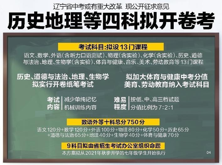 按照征求意见稿,本方案拟从2021年秋季开学的七年级学生开始执行,拟将美育、劳动教育纳入中考考试科目,考试科目为13门,历史、道德与法治、地理、生物学科目拟实行开卷纸笔考试。