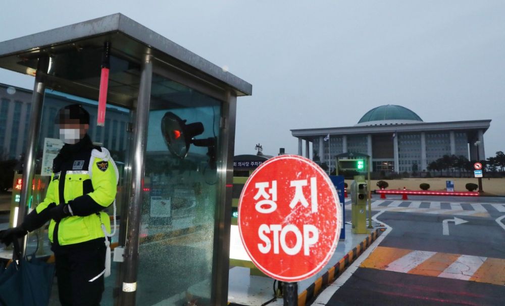 2020年2月25日,在韩国首尔,警方工作人员在已暂时关闭的韩国国会大楼前限制出入车辆。(新华社/纽西斯通讯社)