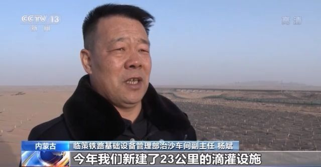 临策铁路基础设备管理部治沙车间副主任 杨斌:今年我们新建了23公里的滴管设施,打了两口井。过了春节我们就在线路两侧和网格里大面积种植梭梭和柠条,通过生物治沙,改善大自然的环境。