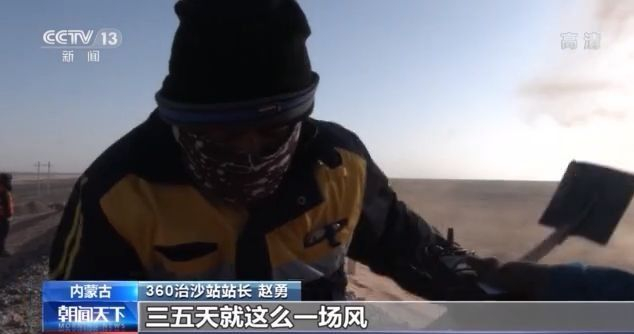 360治沙站站长 赵勇:在这个季节这个风算是平常的,三五天就这么一场风。在大风天里干活是冻手、冻脸、冻脚。