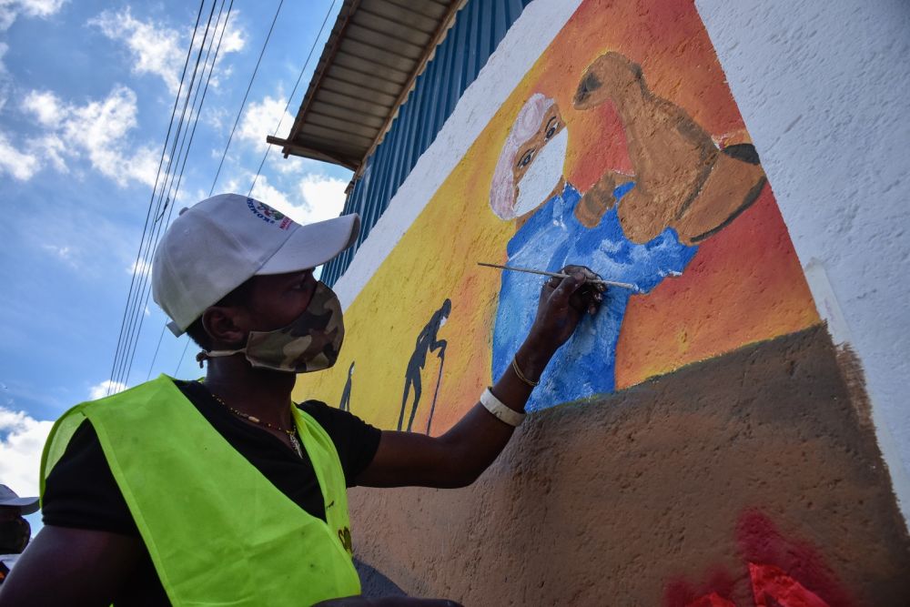 2020年7月10日,工作人员在肯尼亚纳库鲁郡绘制抗疫海报。新华社发(谢赫·马伊纳摄)