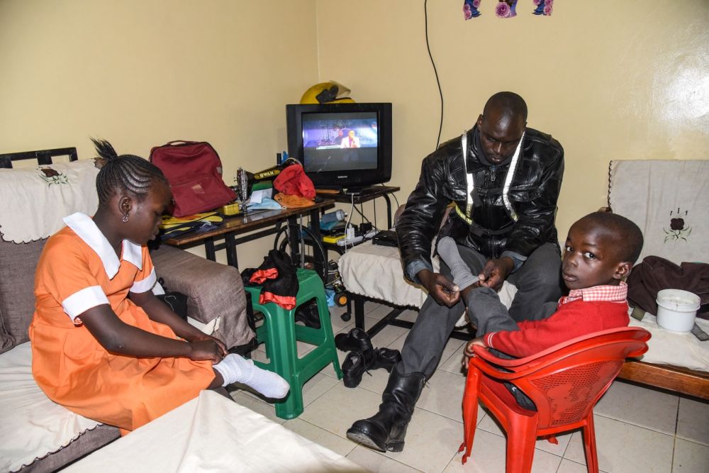 2021年1月22日,在肯尼亚首都内罗毕,骑手摩西·奥蒂诺在家帮助孩子们换衣服准备去学校。新华社发