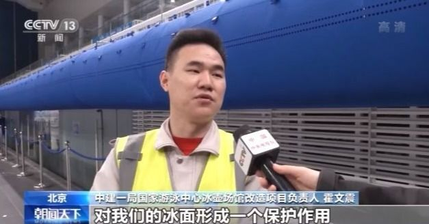 中建一局国家游泳中心冰壶场馆改造项目负责人 霍文震:通过我们的制冰系统,要保证冰面温度达到-8.5度。通过我们的空调系统,要保证看台温度在16度到18度,这样我们的观众有一个舒适的观赛体验。看台下方的布袋风管是我们的除湿系统,通过它来输送干冷的空气,来调节冰场上空的温湿度。通过它也能隔绝来自看台的湿热空气,对我们的冰面形成一个保护作用,让冰面不结霜,不起雾。