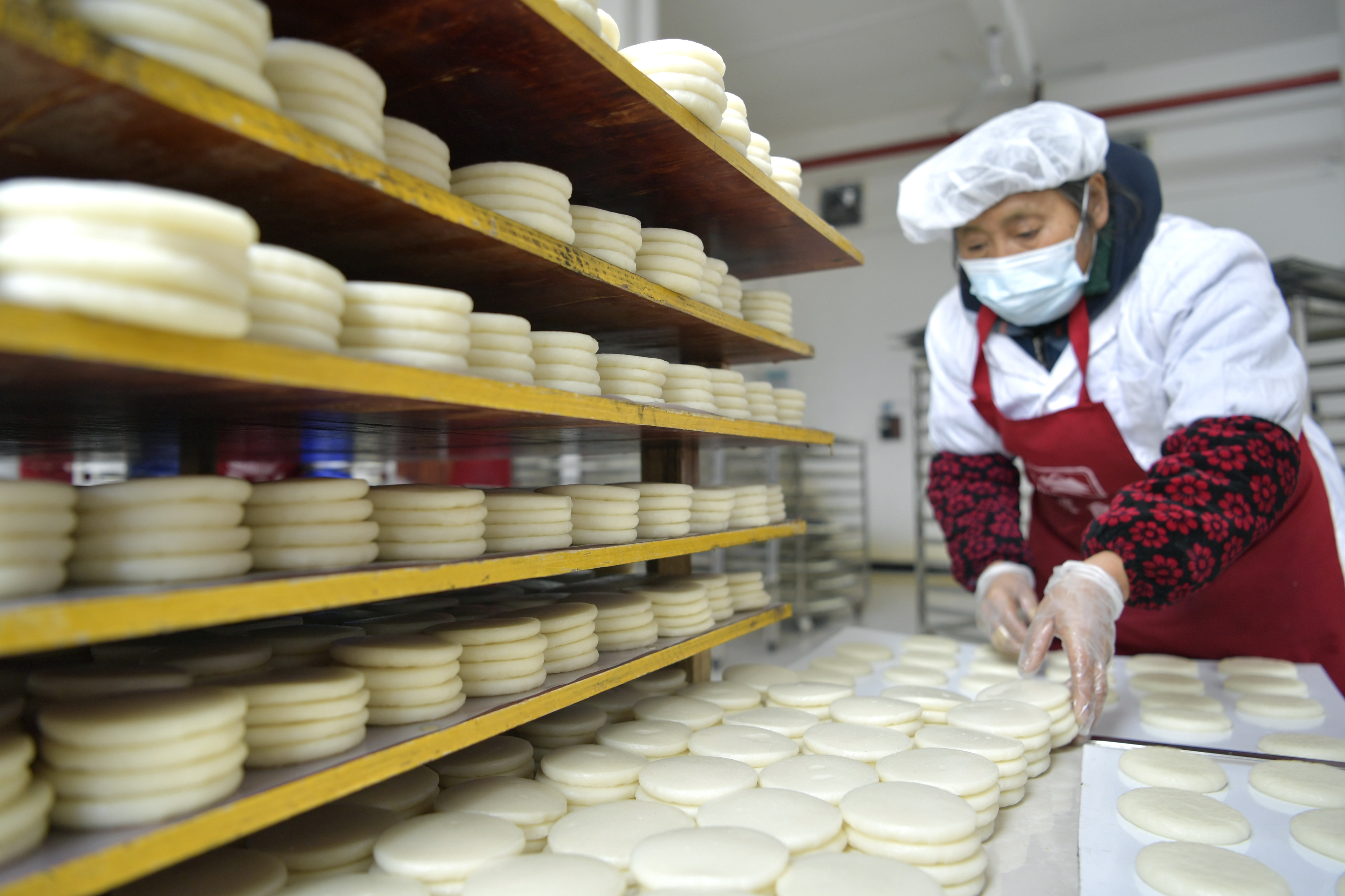 2020年12月30日,在湖北省宣恩县万寨乡伍家台易地扶贫搬迁安置小区一食品加工厂,搬迁农民在制作糍粑。新华社发宋文 摄