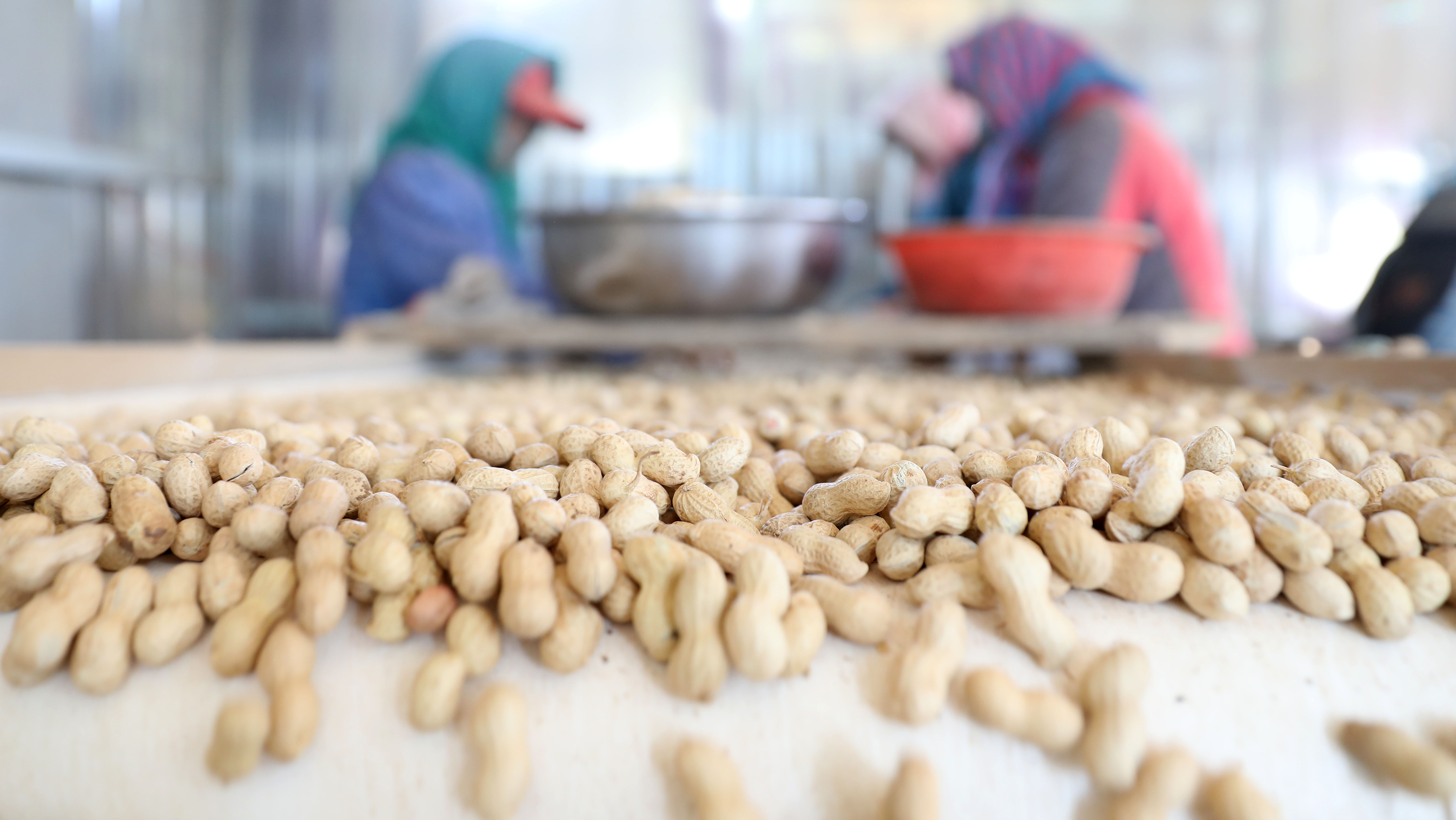 在辽宁省锦州市义县张家堡镇官场沟村一家农业企业里,工人在生产线上将收获的花生进行分拣(2020年11月4日摄)。新华社记者姚剑锋 摄