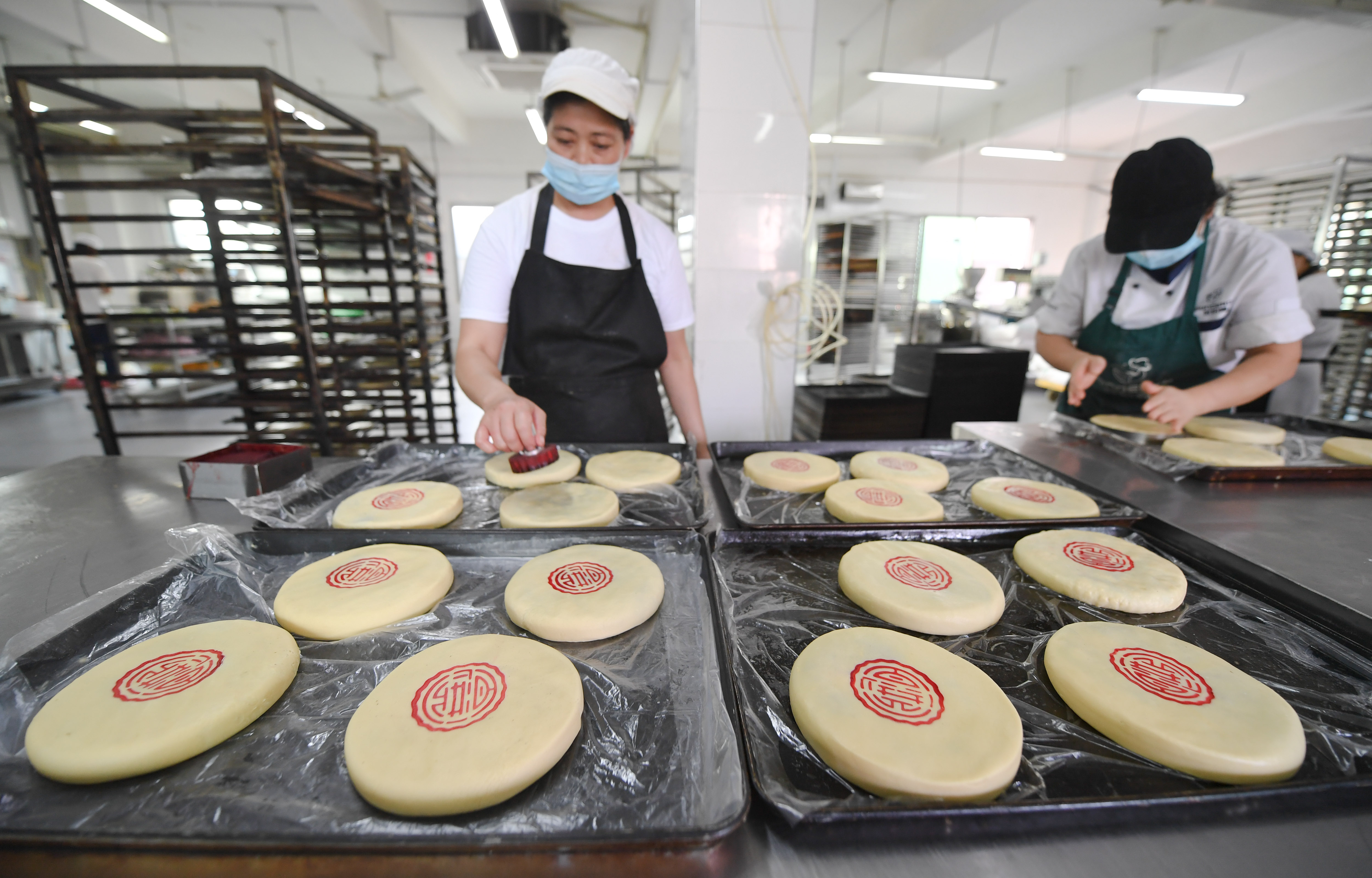 2020年9月25日,在福州老字号糕点企业百饼园的加工车间,师傅们在制作福州传统糕点——礼饼。新华社记者宋为伟 摄