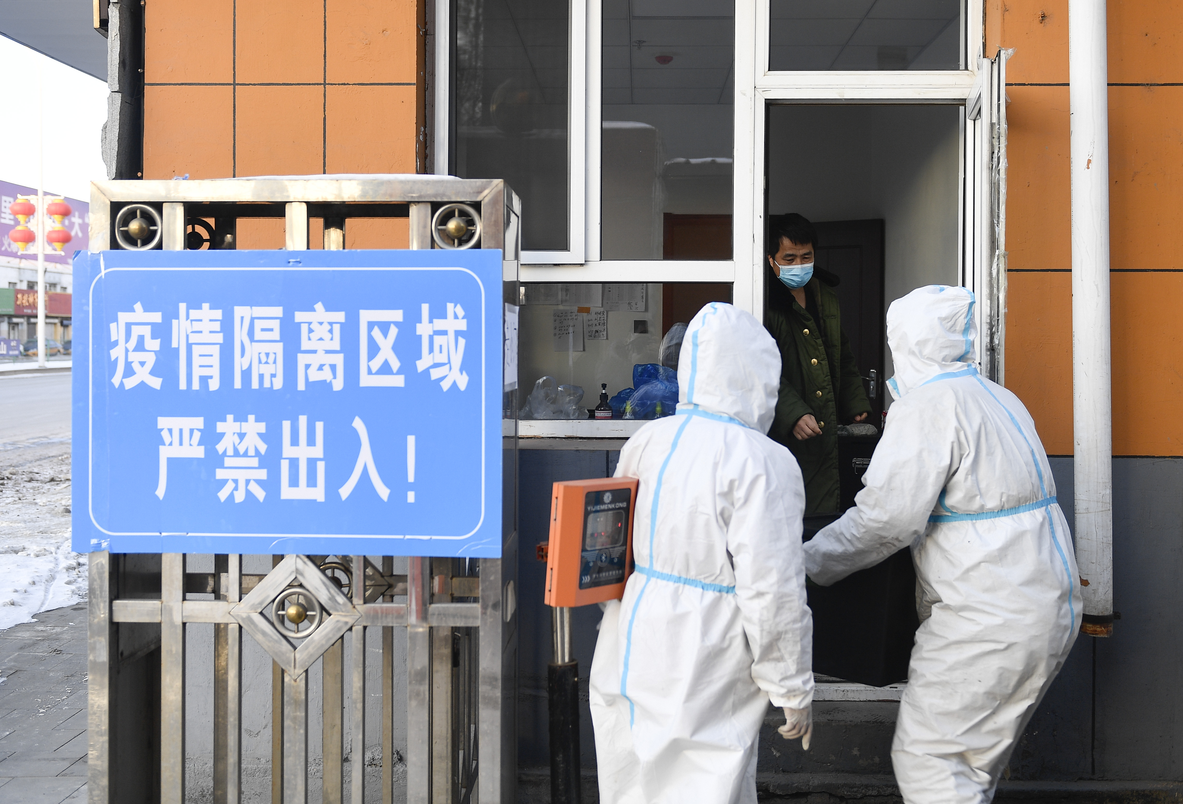 2月4日,在吉林省通化市东昌区一隔离点,餐饮配送人员为隔离点内工作人员及隔离人员配送晚餐。新华社记者 许畅 摄