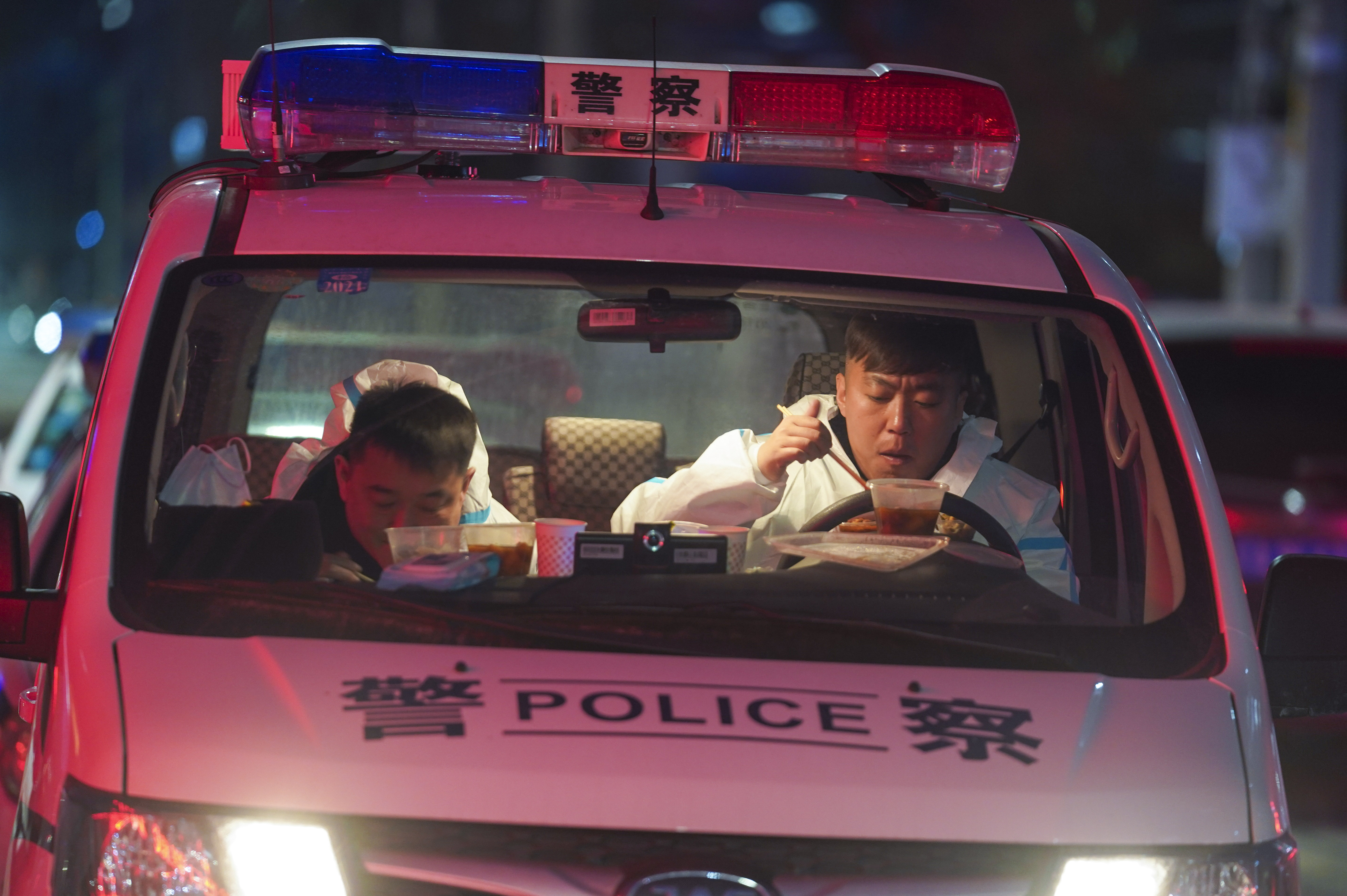 2月4日,在吉林省通化市东昌区一处卡点,值守人员在车中吃饺子。新华社记者 许畅 摄
