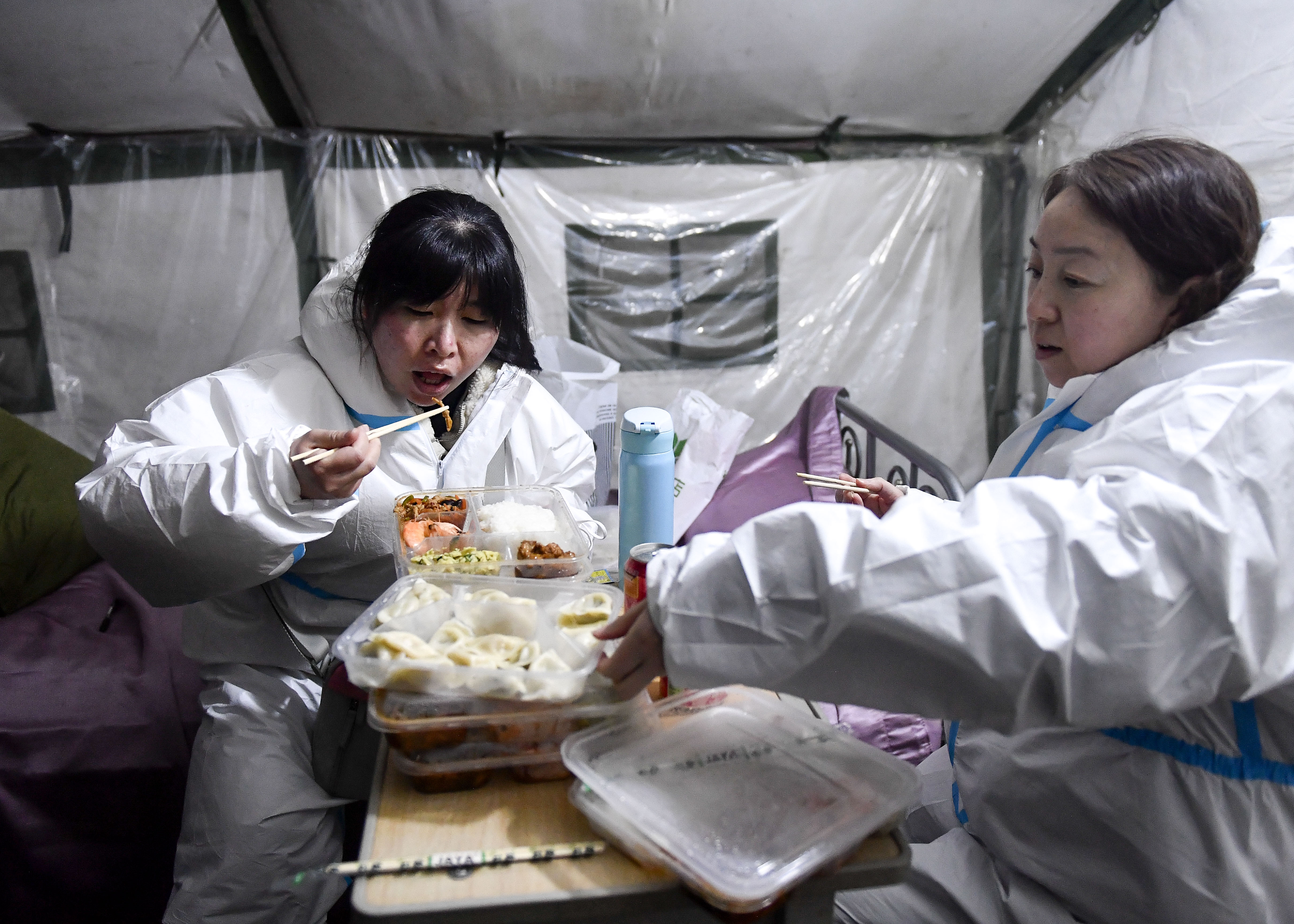 2月4日,在吉林省通化市东昌区一处卡点,值守人员在临时帐篷中吃饺子。新华社记者 许畅 摄