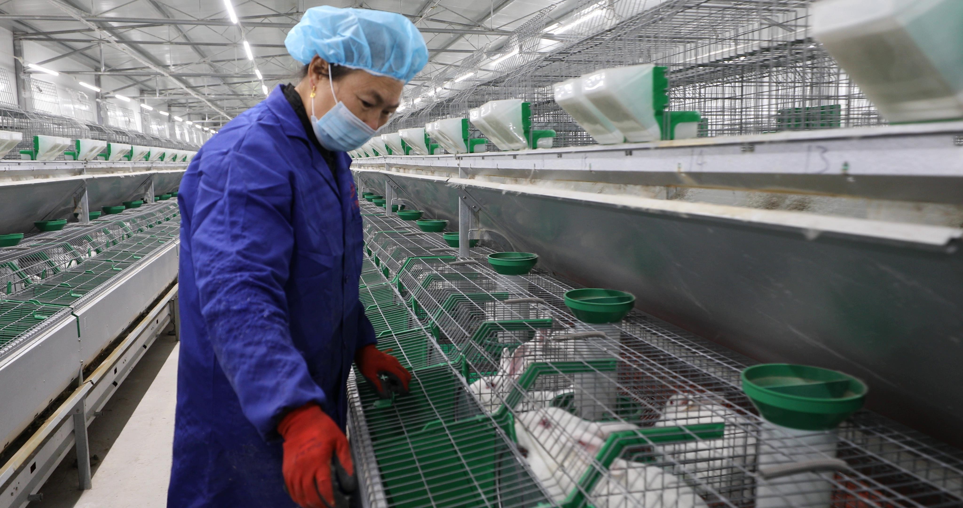 重庆渝北区统景镇长堰村肉兔养殖场内,工作人员正检查兔笼的情况。新华社记者李爱斌 摄