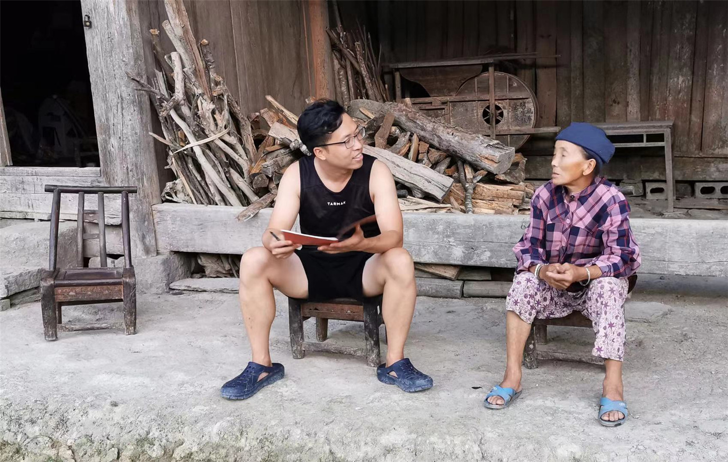 2019年8月17日,时鹏在湖南省桑植县仓关峪村贫困户周月芝家中走访,询问家里安全饮水情况。图片由受访者提供
