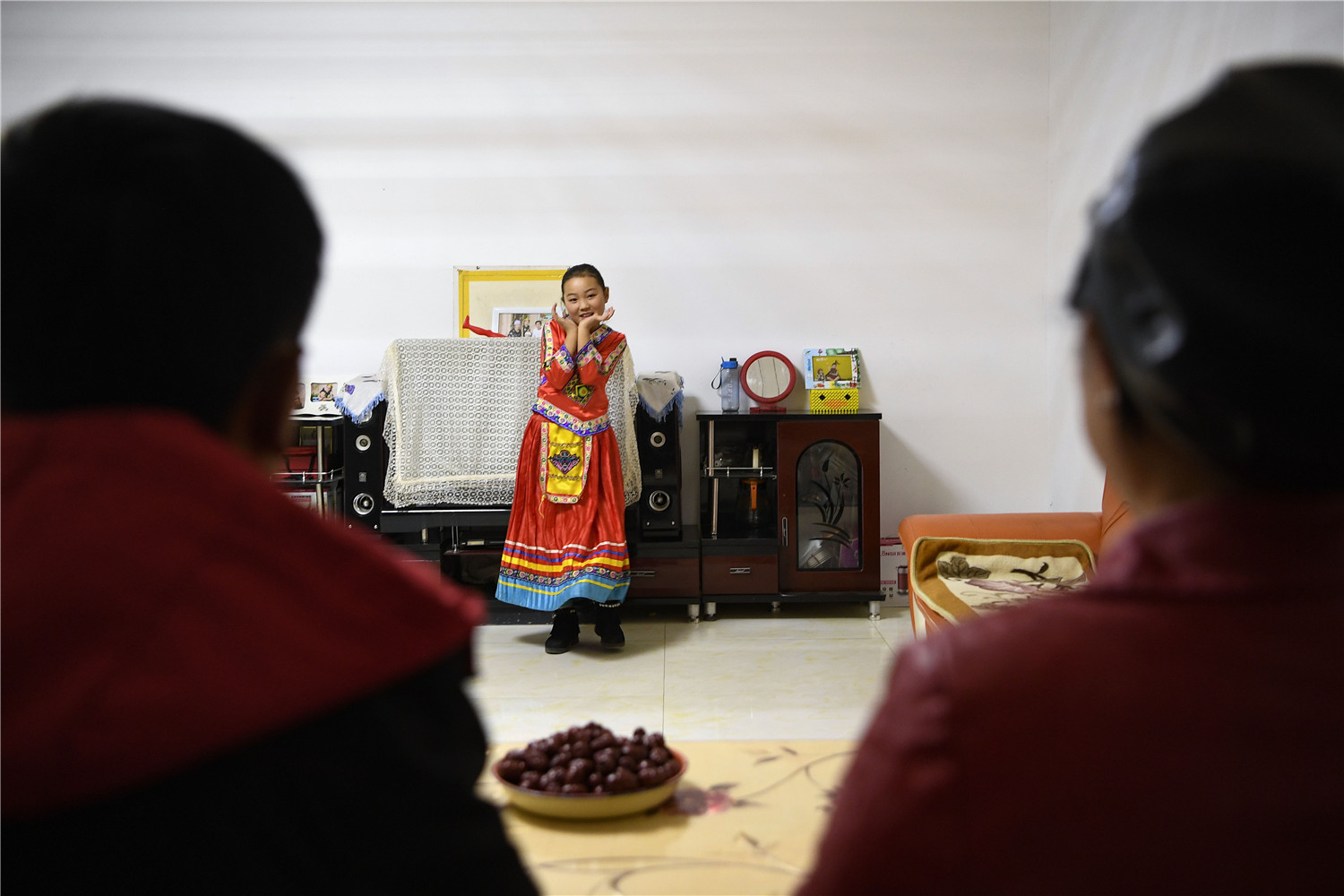 摆西彦(右)在家中看女儿跳舞。 新华社记者杨植森摄