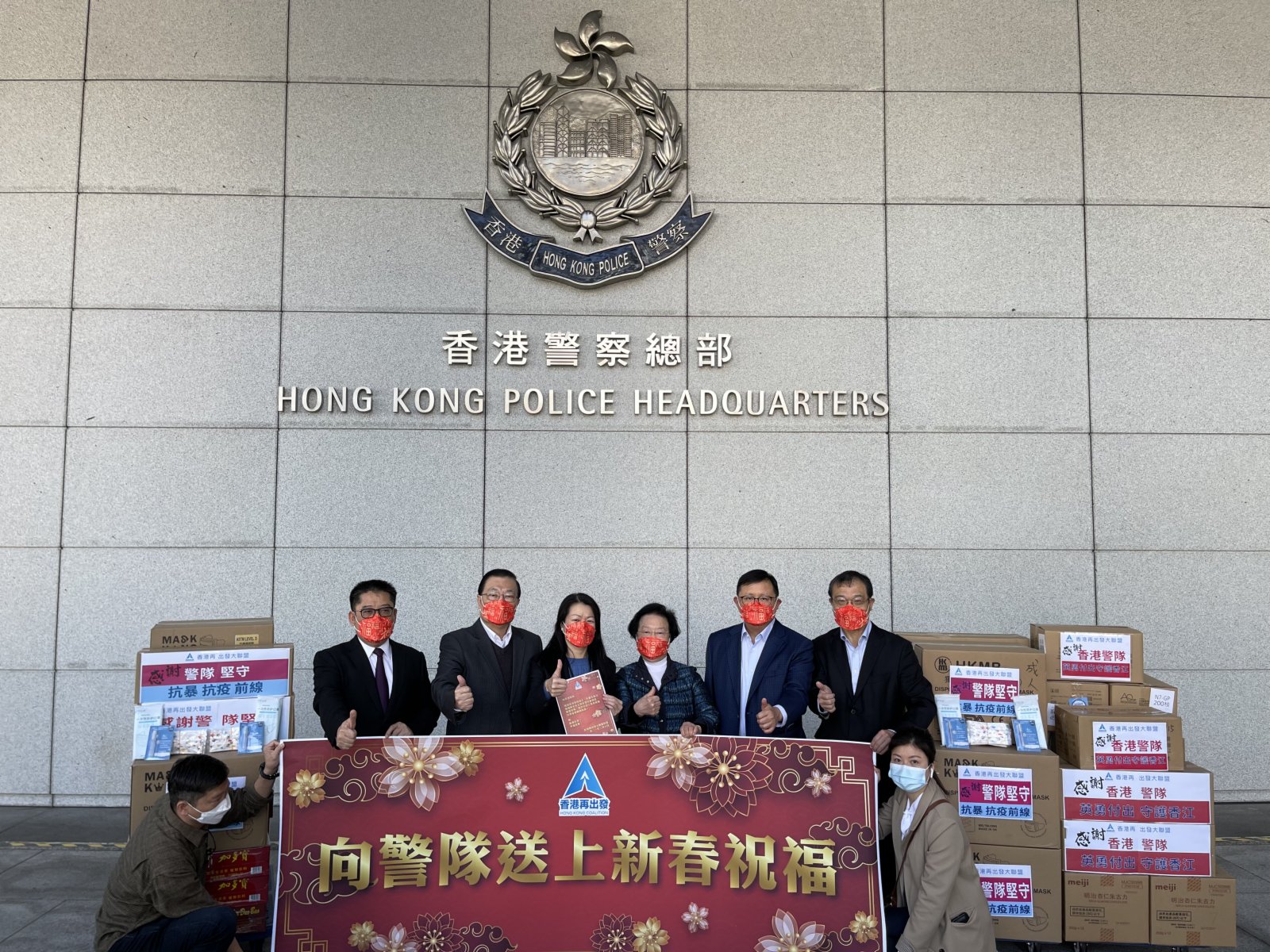 “香港再出发大联盟”5日前往香港警察总部,送上慰问卡、口罩等慰问品,向警务人员致以美好的新春祝福,并表达对警务人员守护香港的敬意。