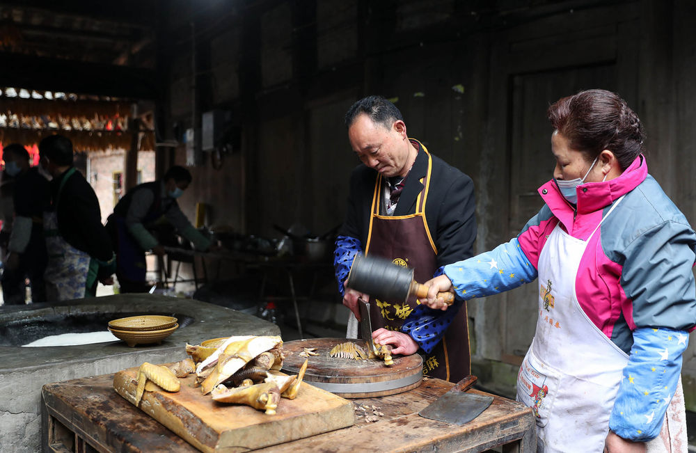 ↑ 2月4日,在李家大院,厨师们在做当地的传统名小吃——荥经棒棒鸡。