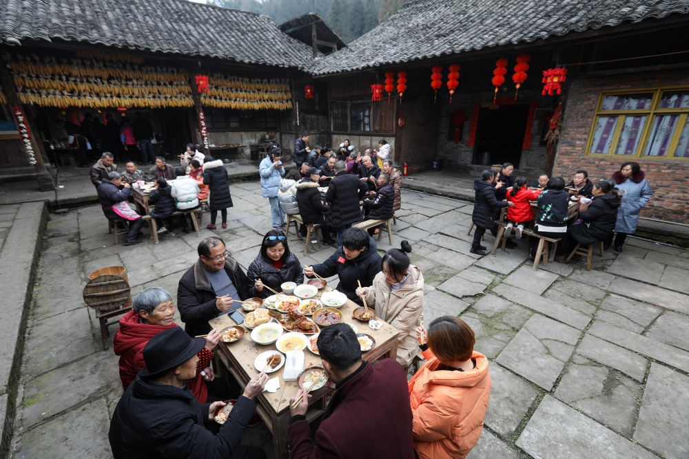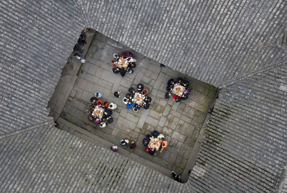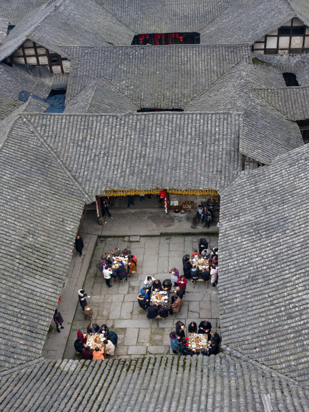 ↑2月4日,李家大院的居民在吃“小年”团年饭(无人机照片)。