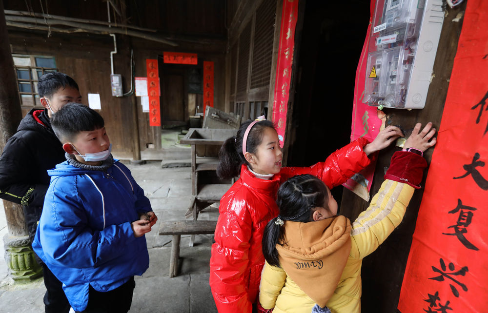 ↑ 2月4日,李家大院的徐梓菲、巫可欣、杨俊超和严鑫(从右到左)四个小朋友把大人切下的鱼尾贴在家门上,寓意年年有余。