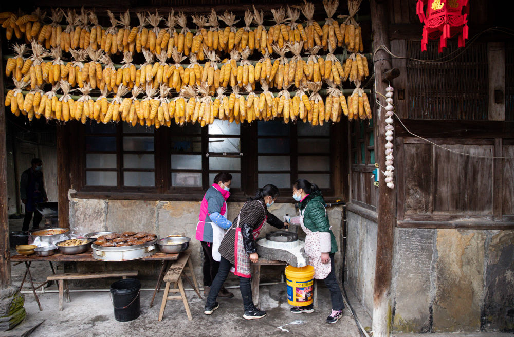↑ 2月4日,李家大院的妇女们在磨豆浆。