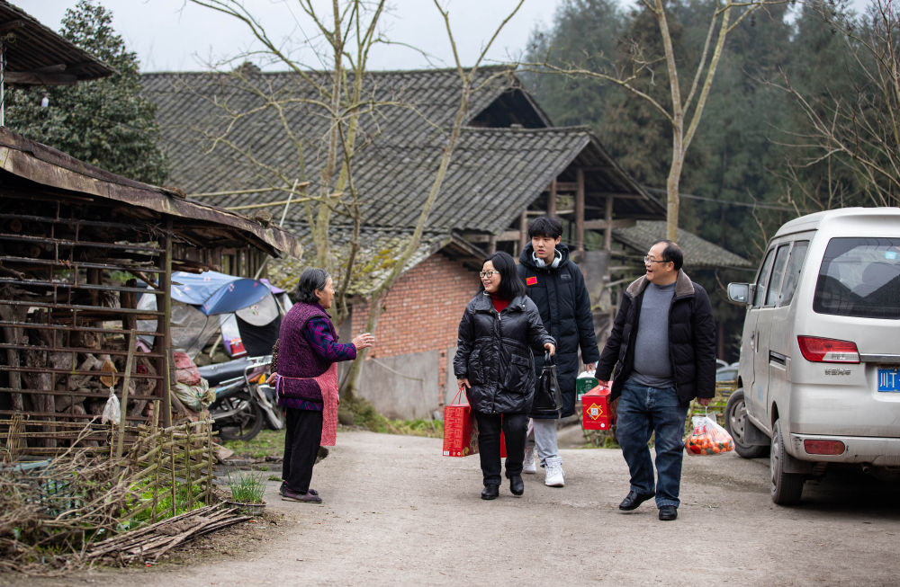 ↑ 2月4日,李家大院的居民李帮强(右一)一家三口提着年货回到齐心村,边走边和邻居打招呼。