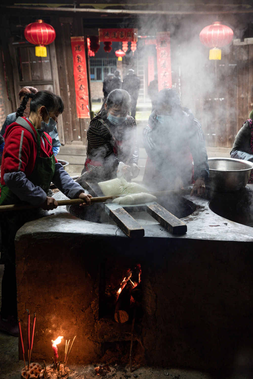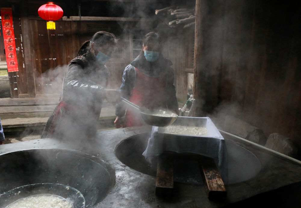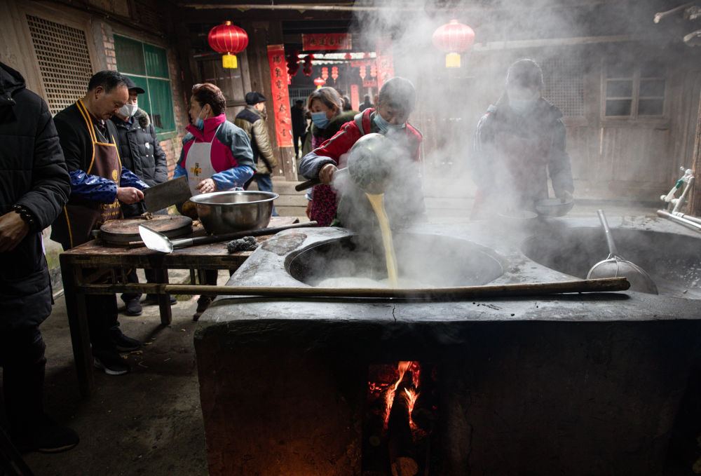 ↑ 2月4日,李家大院的妇女们在做豆腐。