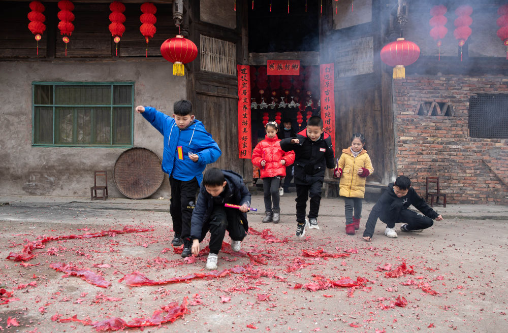 ↑ 2月4日,孩子们在李家大院门口捡拾未放完的炮仗。