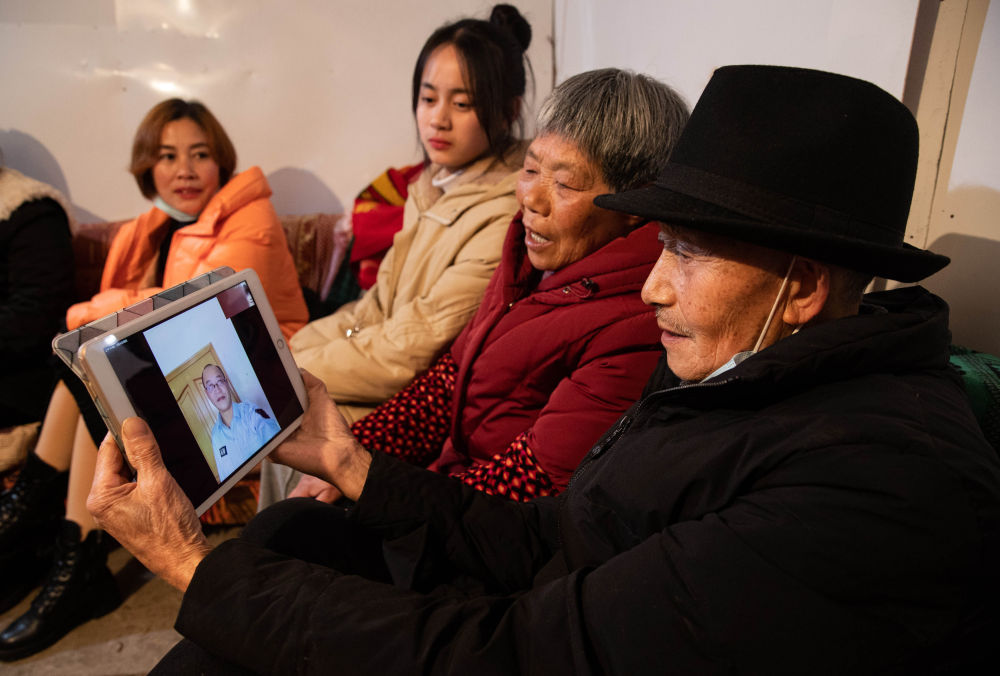 ↑ 2月4日,李家大院的居民李家权(右一)与在上海的大儿子李帮国视频通话。因为疫情,在上海当保安李帮国响应号召就地过年,今年春节不打算回家了。