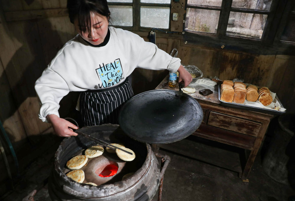 ↑2月4日,李家大院的妇女在做荥经传统名食椒盐饼子。圆圆的饼子,是李家大院“团团圆圆”的美好愿望。