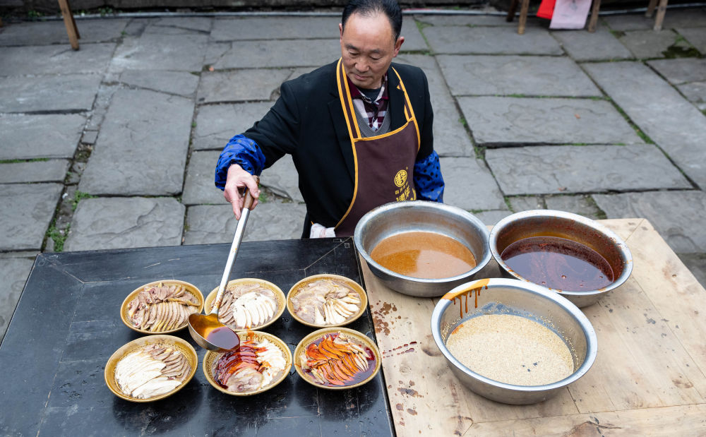 ↑ 2月4日,在李家大院,一位厨师在做当地的传统名小吃——荥经棒棒鸡。