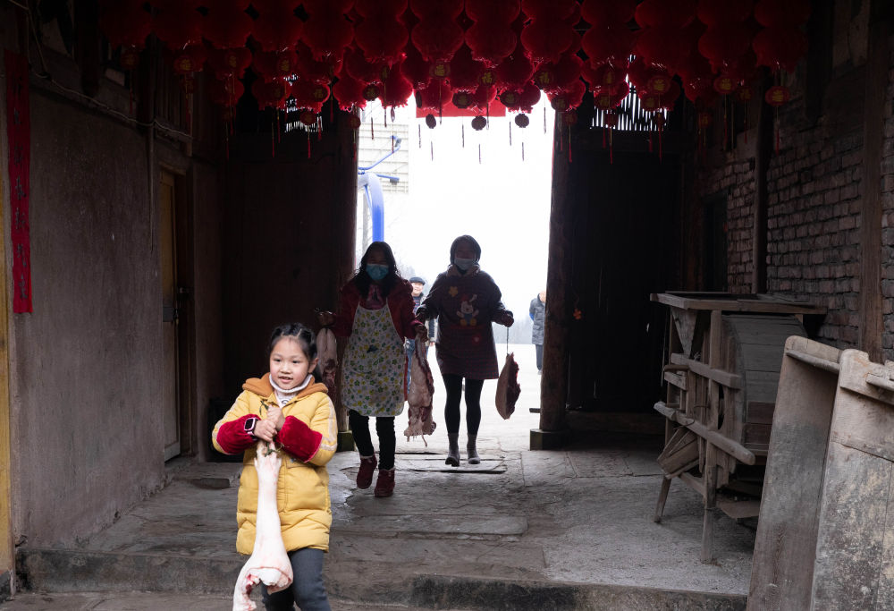 ↑ 2月4日,李家大院的徐梓菲小朋友和妈妈、外婆提着鲜肉准备做“杀猪菜”。当天,徐梓菲的外婆家杀了两头300多斤的猪。