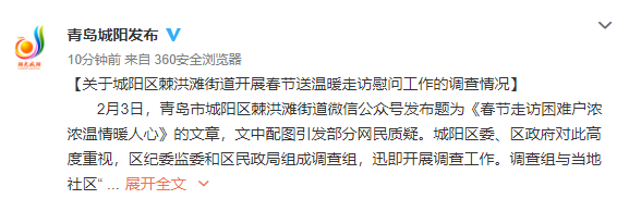 2月3日,青岛市城阳区棘洪滩街道微信公众号发布题为《春节走访困难户浓浓温情暖人心》的文章,文中配图引发部分网民质疑。城阳区委、区政府对此高度重视,区纪委监委和区民政局组成调查组,迅即开展调查工作。