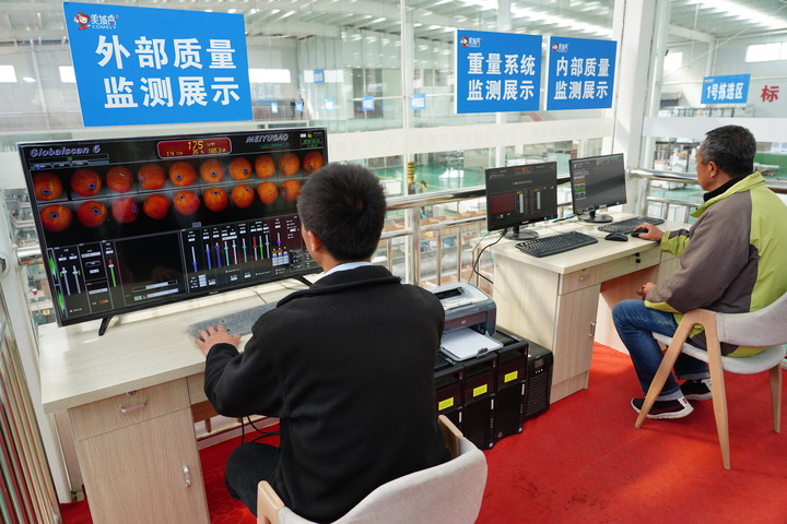 延安洛川县一公司车间,工作人员通过智能选果控制系统监测分选线上苹果的外观以及糖度、糖酸比、是否有霉心病等数据。(新华社记者邵瑞摄)