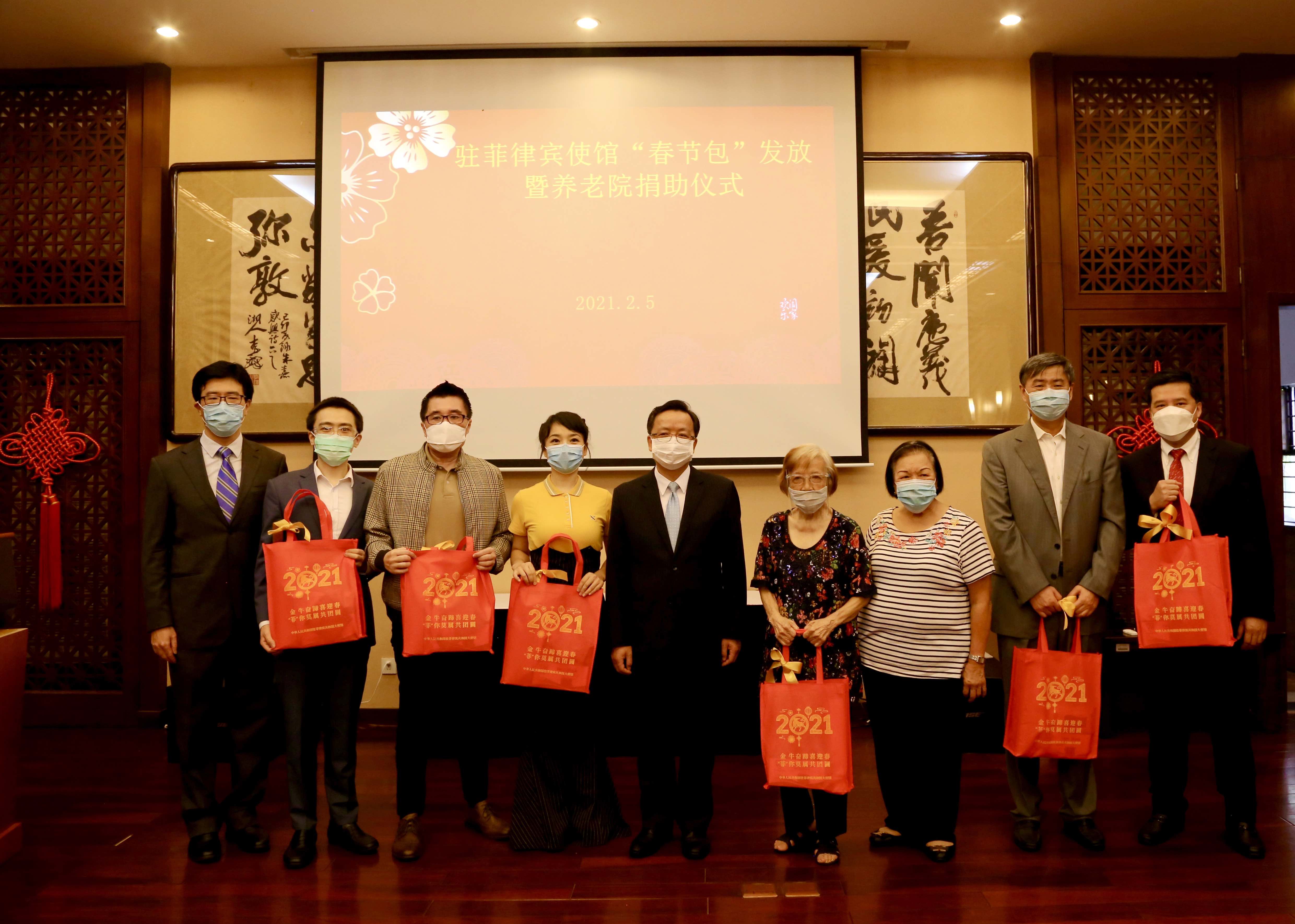 当地时间2月5日,中国驻菲律宾使馆举办“春节包”发放仪式。黄溪连大使向在菲中国留学生、中资企业、媒体人员、困难侨胞等群体代表发放“春节包”,并向所有在菲同胞致以新春问候。