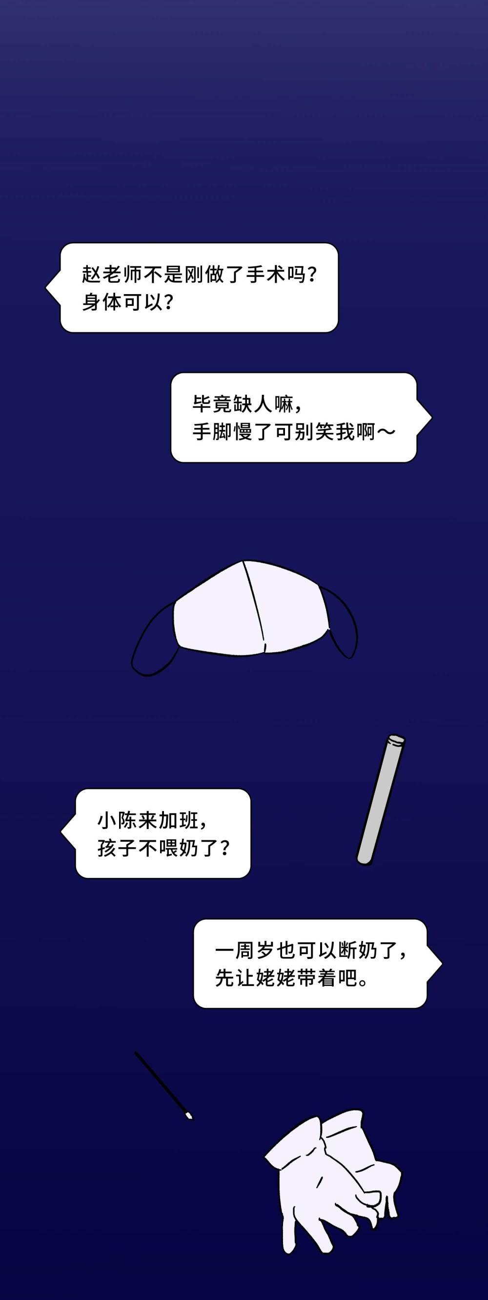 深夜,宋大夫和陈大夫交班,聊起宋大夫的女儿和陈大夫刚满周岁的孩子,两人都不敢说出“想家”这个的词。