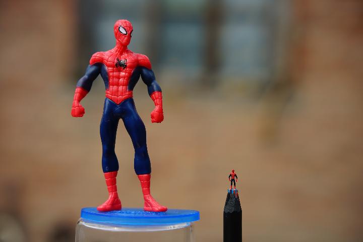 李明君创作雕刻的“笔尖上的蜘蛛侠”(右)与蜘蛛侠玩偶对比图。受访者供图